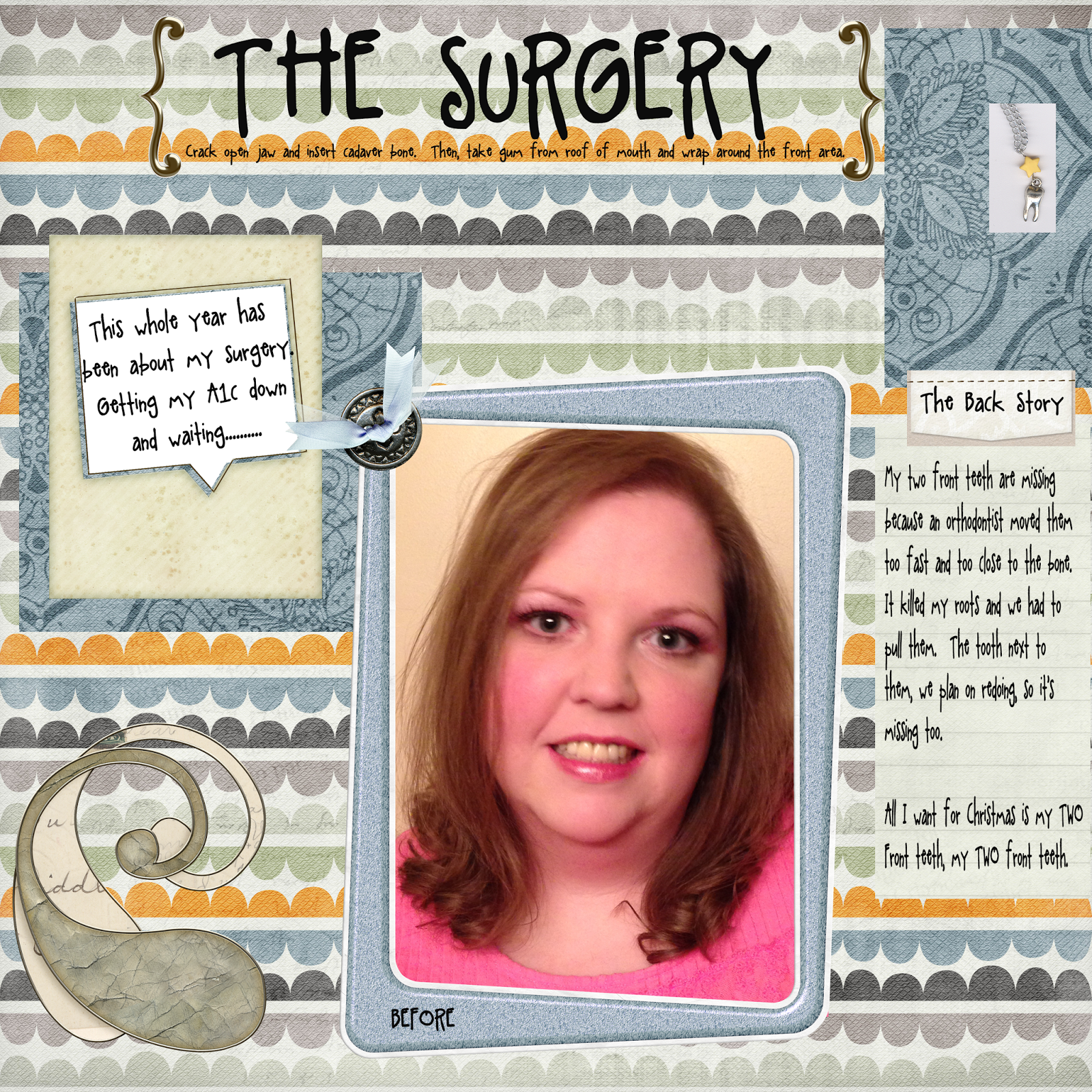 Ok so yesterday I had major surgery. I had a bone & gum graft to my upper jaw. Don't read on if you don't want to hear yucky stuff. They cracked open my upper jaw to insert some more bone and cut gum from the inner part to put it on the outer part to support my jaw for another surgery coming up in about 6 months. Then they will insert implants so I can have teeth that are just like regular teeth, except they don't die and fall out!!! Here is the back story....My old orthodontist moved my teeth too fast and got too close to the bone and it killed the roots to my two front teeth! a couple of years later, my teeth started to get loose, so the dentist pulled them out for me. So for 2 years I had to get ready for my surgery (that I just had). I had some trouble with getting my A1C down because of other medication that I take....and I absolutely have to take it, so I ended up taking daily shots and medication to lower my blood sugar levels because I am diabetic. Anyway, I finally got it down and was able to have the surgery for my teeth. There will be another surgery to follow in 6 months and I am down for a couple of weeks. I will still be designing for gottapixel's contest, but everything else will stop. I am doing fine, they said the surgery went well and a bled very little. I haven't had much pain because I take the pain pills on time and don't let it get painful. I am very puffy in the upper lip & cheek area. Yes, I look like a chipmunk. We will take pics to scrap about it! My scrap line could be Chipmunk Cheeks: my surgery. I'm seeing the layout already......